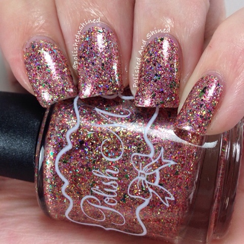 Next up is "Divinity Isle" which is a white crelly with white shimmer and various gold glitters throughout. Love this white polish to be able to use as a base for all your Christmas mani's, which I did, and you'll see at the end of this post. ;-) Formula was great here. I used three coats with top coat for my pictures. I stamped some candy canes using Girly Bits "It Was The Fireball" and Uberchic Christmas 01 plate.